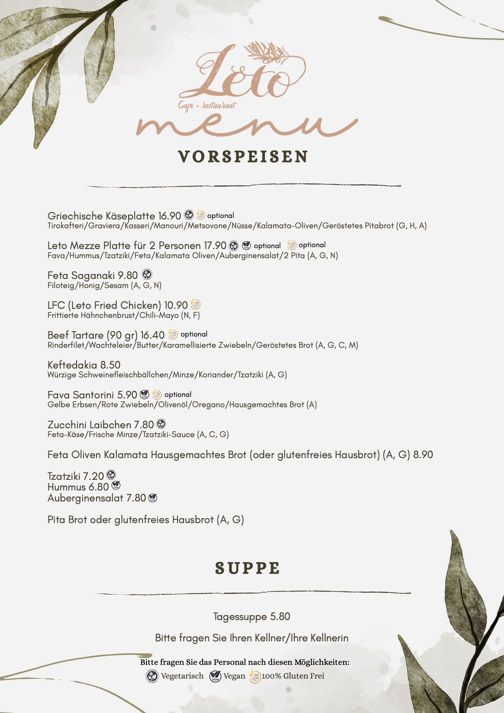 Yes, the restaurant LETO Restaurant Bar serves Greek food and also serves Mediterranean, European, Eat & Drink food.